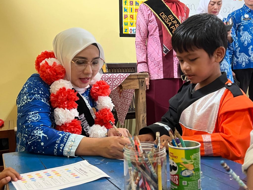 Selain memberikan motivasi kepada para guru, Bunda PAUD Kabupaten Jepara juga berinteraksi langsung dengan anak-anak melalui kegiatan belajar sambil bermain. Ia berdialog langsung dan memberikan semangat kepada para siswa.