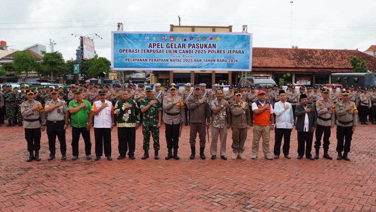 JEPARA – Polres Jepara menggelar apel pasukan Operasi Lilin Candi 2025 di Lapangan Dharma Endra Laksana Polres Jepara, Jumat (19/12/2025). Apel tersebut menjadi tahap akhir pengecekan kesiapan personel dan sarana prasarana pengamanan Natal 2025 dan Tahun Baru 2026.