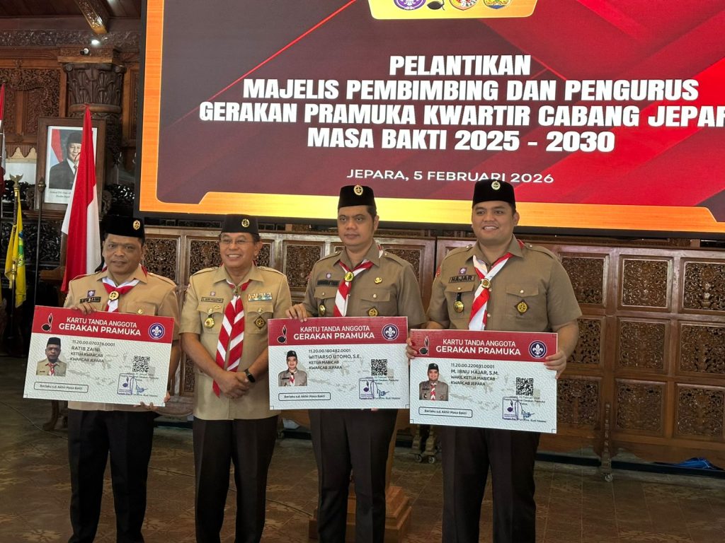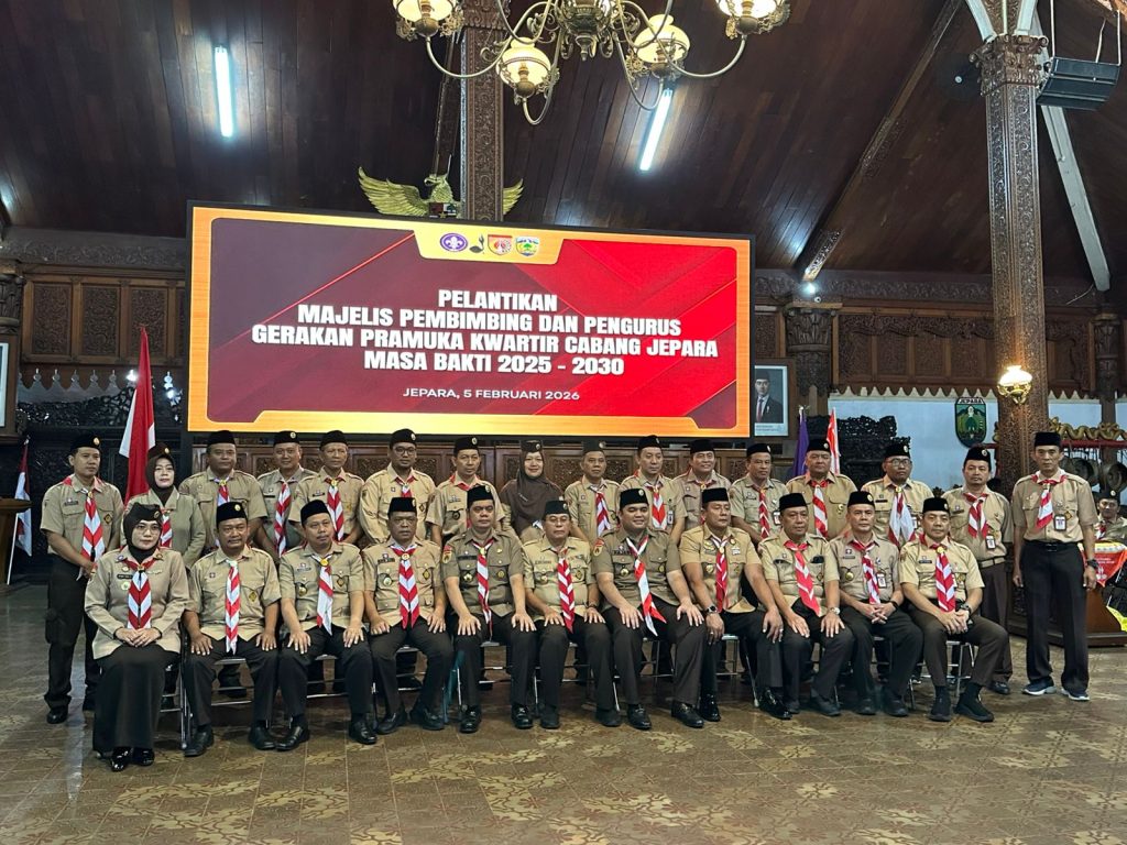 JEPARA — Kwartir Cabang (Kwarcab) Gerakan Pramuka Jepara resmi melantik Majelis Pembimbing Cabang (Mabicab) dan Pengurus Kwarcab masa bakti 2025–2030 dalam sebuah upacara khidmat yang digelar di Pendopo R.A. Kartini, Kamis (5/2/2026). Pelantikan ini menjadi momentum strategis dalam memperkuat peran Gerakan Pramuka sebagai wadah pembinaan generasi muda di Kabupaten Jepara.