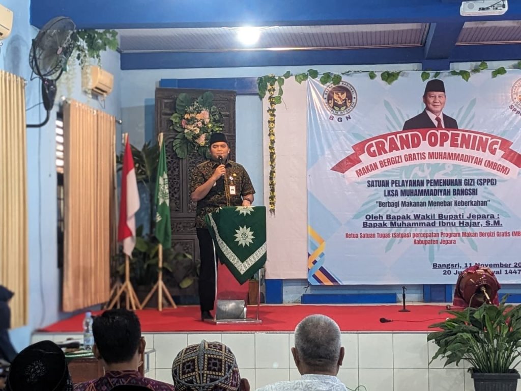 JEPARA — Wakil Bupati Jepara Muhammad Ibnu Hajar atau yang akrab disapa Gus Hajar, meresmikan dapur Satuan Pelayanan Pemenuhan Gizi (SPPG) yang dikelola LKSA Muhammadiyah Jepara di kompleks Perguruan Muhammadiyah Bangsri, Selasa (11/11/2025)